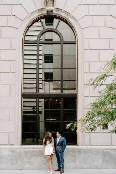 Generally, couples pick two outfits for an engagement session: a more formal outfit and a casual outfit. I recommend saving your favorite outfit for later in the session, when couples usually feel more comfortable in front of the camera. And don’t forget to bring a few accessories! Statement earrings, cute shoes and classic watches are great ways to add detail to outfits.